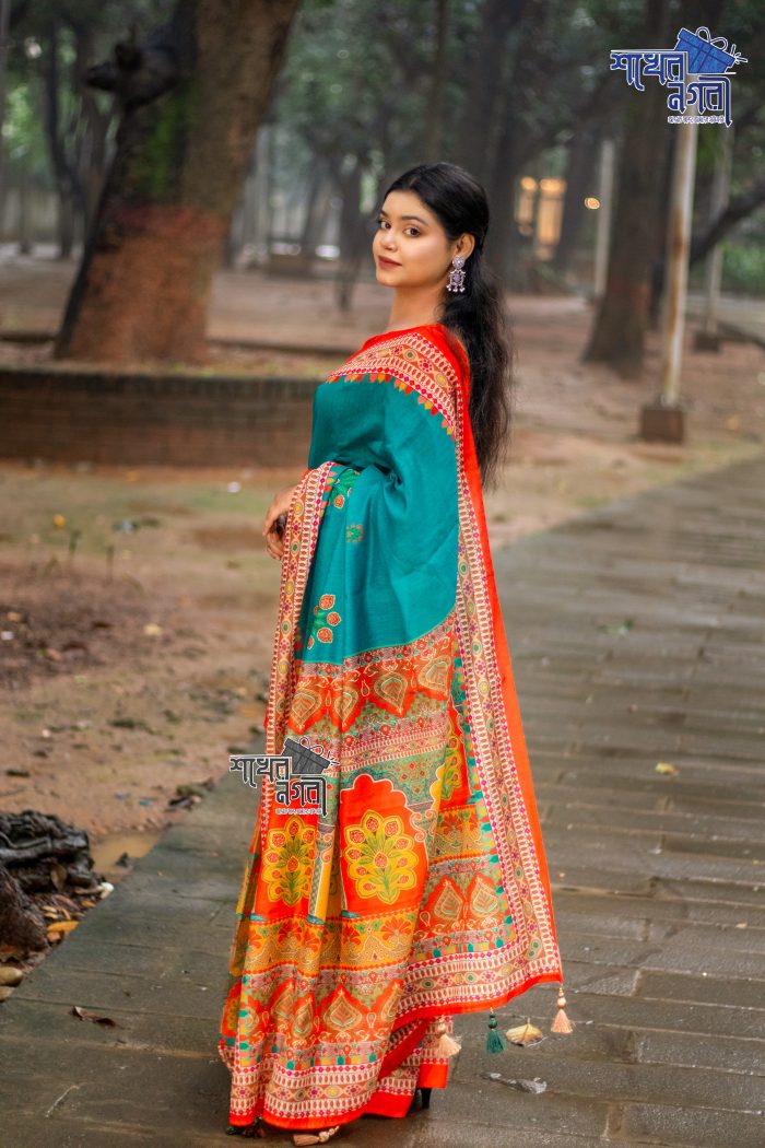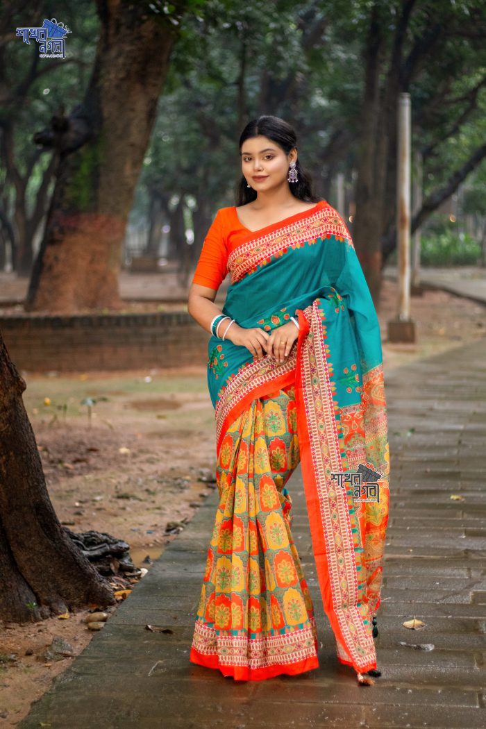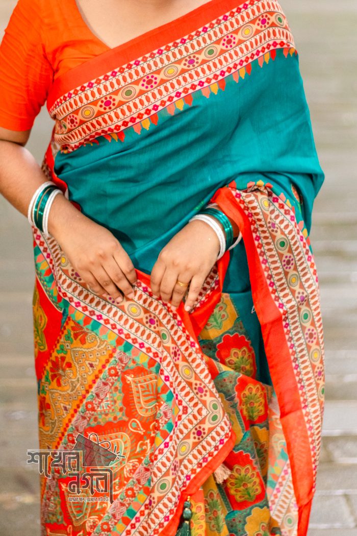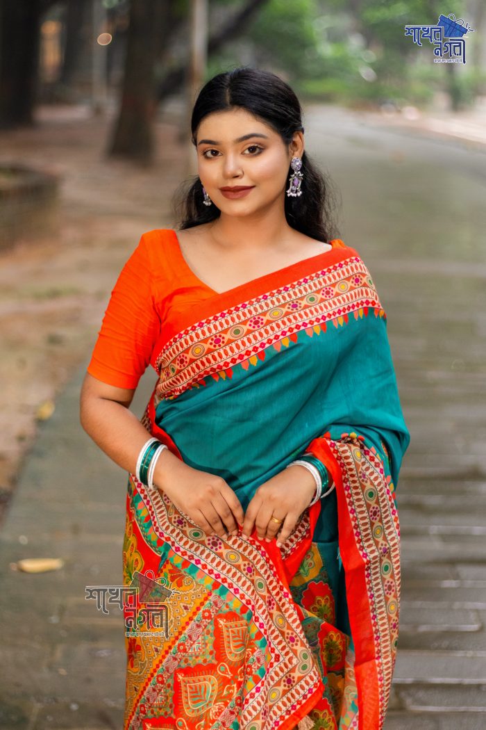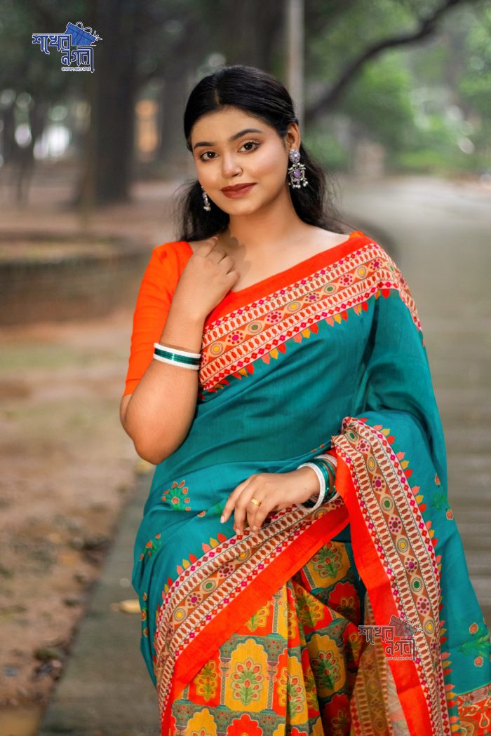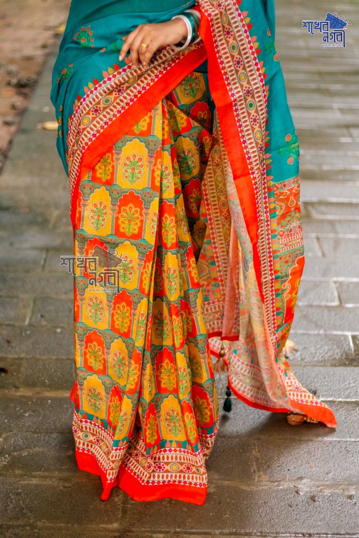 ঐতিহ্যবাহী কমলা ও নীল রঙের শাড়ি, ফুলের নকশায় সজ্জিত। এই শাড়ি তার উজ্জ্বল রঙ এবং নরম কাপড়ের কারণে এক অনন্য শৈলী ও সৌন্দর্য উপস্থাপন করে। বিশেষ অনুষ্ঠানে কিংবা দৈনন্দিন পরিধানে পরিধান করা যাবে, যা আপনাকে দেবে ক্লাসিক এবং চমকপ্রদ লুক এনে দিবে। নিখুঁত ডিজাইন ও সুন্দর রঙের সংমিশ্রণ আপনাকে একটি নতুন চেহারা ও অনুভূতি প্রদান করবে।